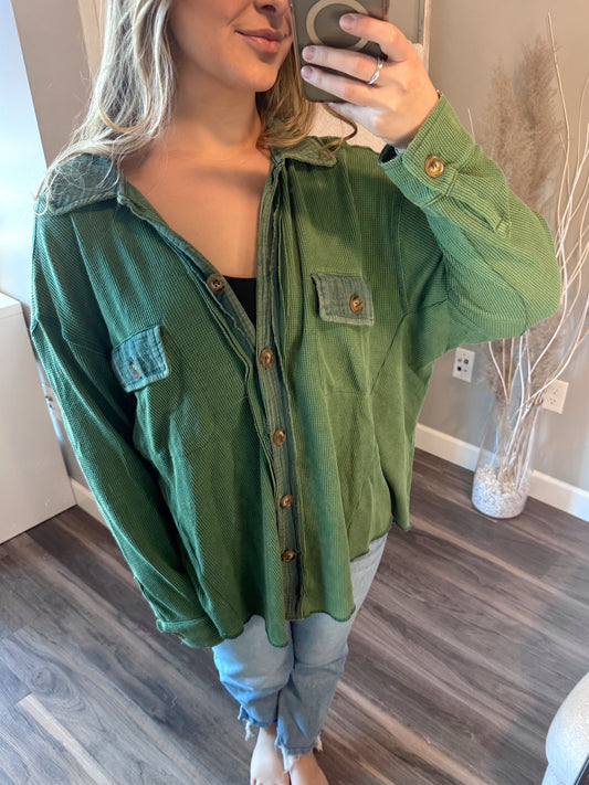 Annie Waffle-Knit Button Down Shirt Green