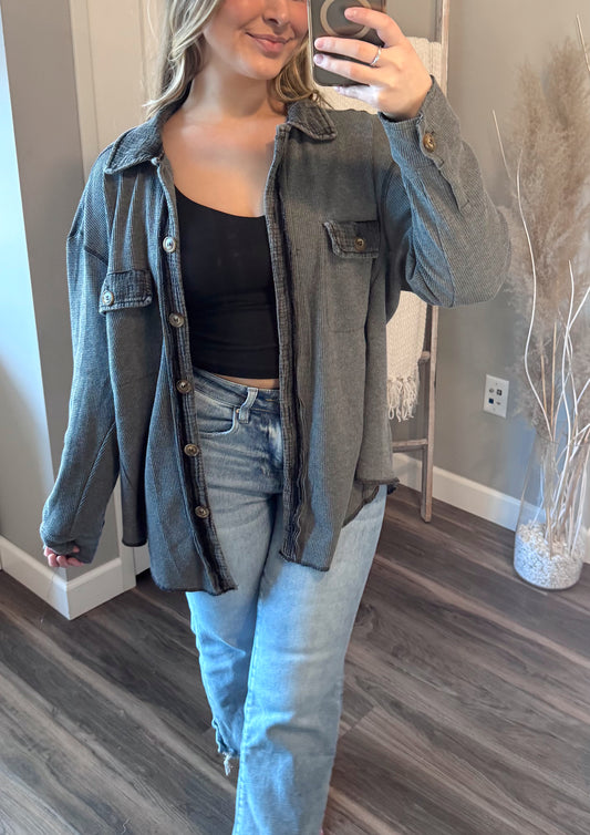 Annie Waffle-Knit Button Down Shirt Charcoal